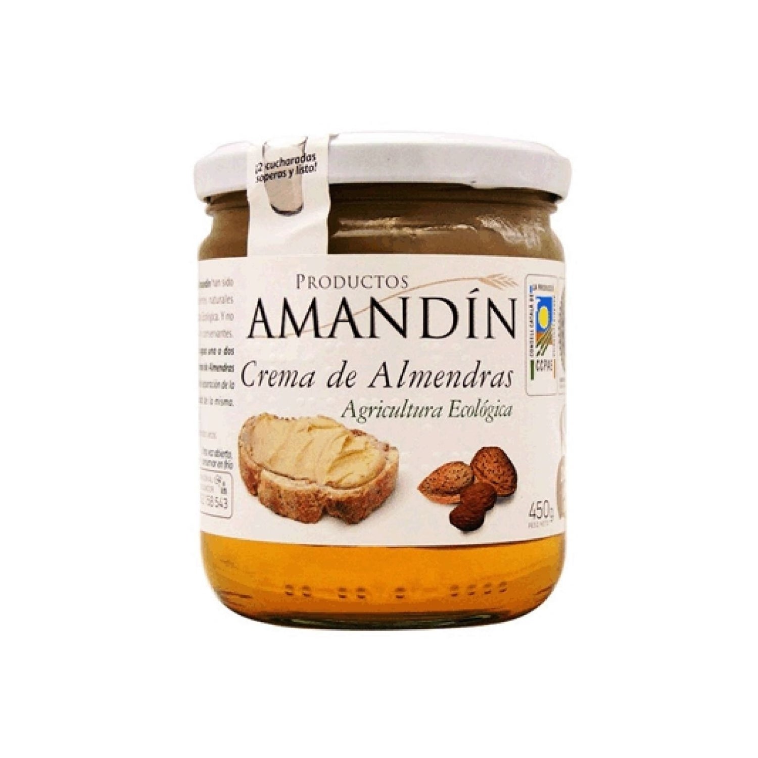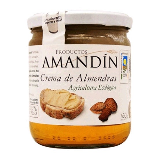 Amandin Crema Almendras Blanca Eco 450g to ekologiczny krem z białych migdałów, który można rozsmarować na tostach lub rozcieńczyć w płynach. Sporządza się go z wody i ekologicznych migdałów, słodzony fruktozą. Migdały są bogate w węglowodany i magnez, który pomaga w utrzymaniu zdrowych zębów i zmniejsza bezsenność. Zawiera potas, witaminę E, witaminy A i B, wapń, żelazo i cynk. Odpowiednie dla wegan.