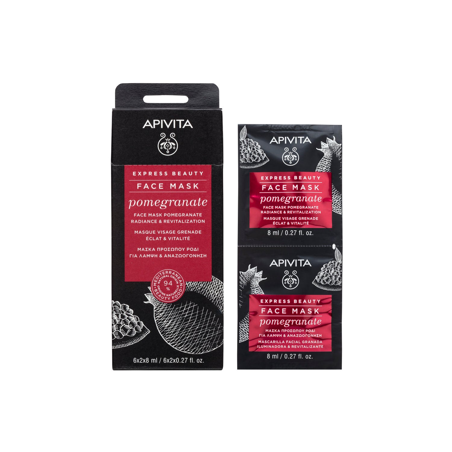 Maska granatowa Apivita Express Beauty da Twojej twarzy więcej światła i witalności . To opakowanie składa się z 6 produktów po 2 sztuki , które mają następującą charakterystykę: