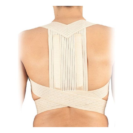 Regulowana elastyczna podpórka pod plecy zaprojektowana w celu wsparcia pleców, ramion i górnej części pleców. Przeznaczone dla osób, które muszą skorygować złą postawę ciała z powodu urazu lub osłabienia mięśni. Działa jako podpora, która pomaga zapobiegać takim problemom, jak ból pleców, nieprawidłowa krzywa kifotyczna, wygięte plecy i drobne dolegliwości. Wykonane z miękkiego, elastycznego i oddychającego materiału bawełnianego. Z wyjmowanymi plastikowymi wałkami ochronnymi, które znajdują się po bokach kręgosłupa. Na końcach znajdują się dwa paski z rzepami, które zapewniają wygodne i bezpieczne dopasowanie. Rozmiar odpowiada średnicy od 75 do 85 cm.