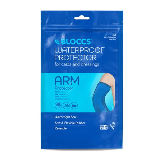 Wodoodporny ochraniacz na szyny i gipsy na ramieniu, wygodny i bezpieczny. Zawiera miękką warstwę przeznaczoną do ochrony plastrów, opatrunków, opatrunków pooperacyjnych i bandaży podczas pływania i kąpieli morskich. Pozwala użytkownikowi na kąpiel bez zamaczania kontuzjowanego obszaru ciała. Wyprodukowano w Wielkiej Brytanii. Jest to produkt wielokrotnego użytku, wykonany z wytrzymałego, elastycznego materiału gumowego. Pasuje wygodnie powyżej łokcia i pozwala na oddzielenie kciuka od reszty palców w celu zachowania mobilności. Kolor niebieski, odpowiedni dla dorosłych.