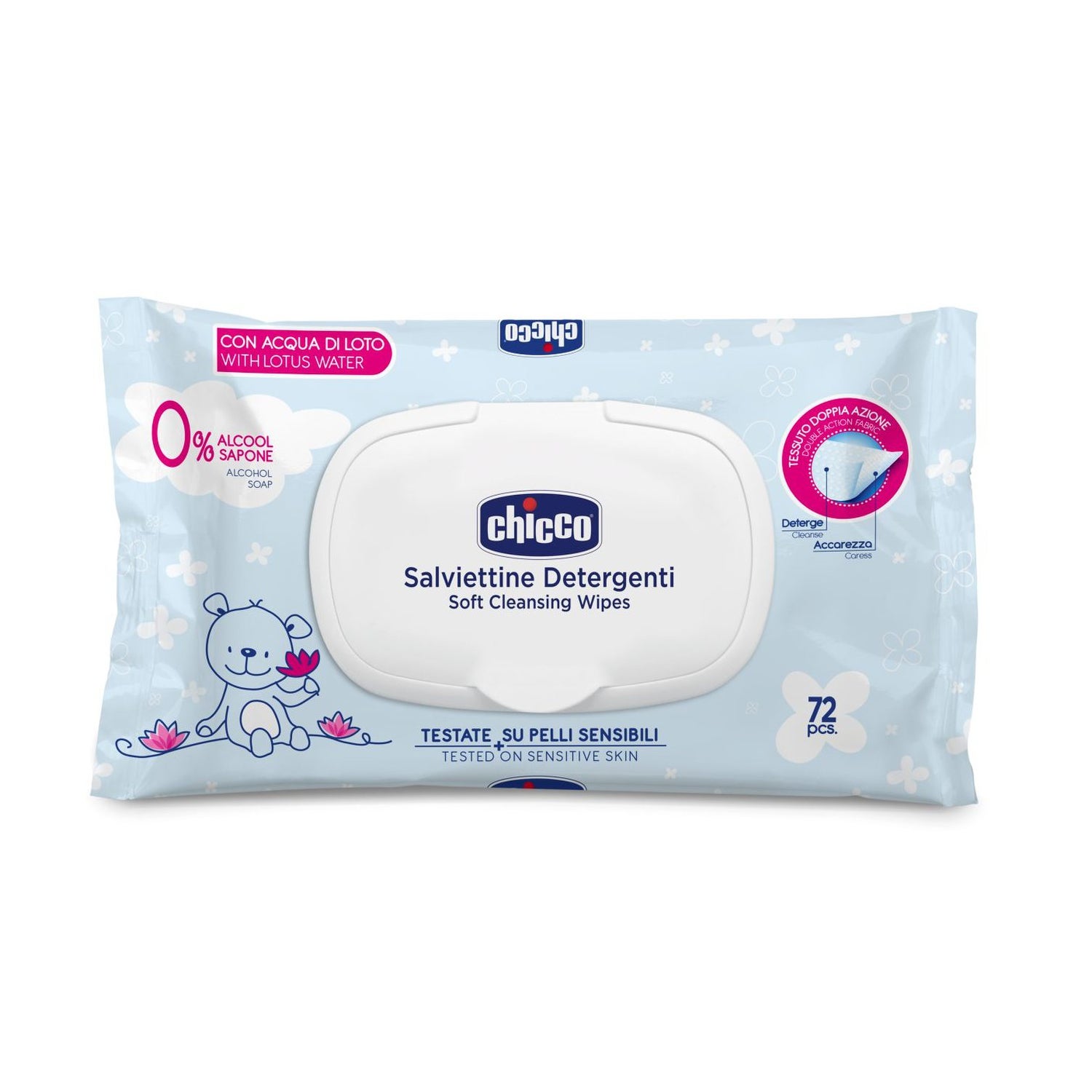 Chusteczki nawilżane Chicco są idealne do higieny podczas zmiany pieluszki lub do czyszczenia twarzy i rąk dziecka. Wykonane są z delikatnej tkaniny o podwójnym działaniu, która zapewnia głębokie oczyszczenie wrażliwej skóry, usuwając zanieczyszczenia.