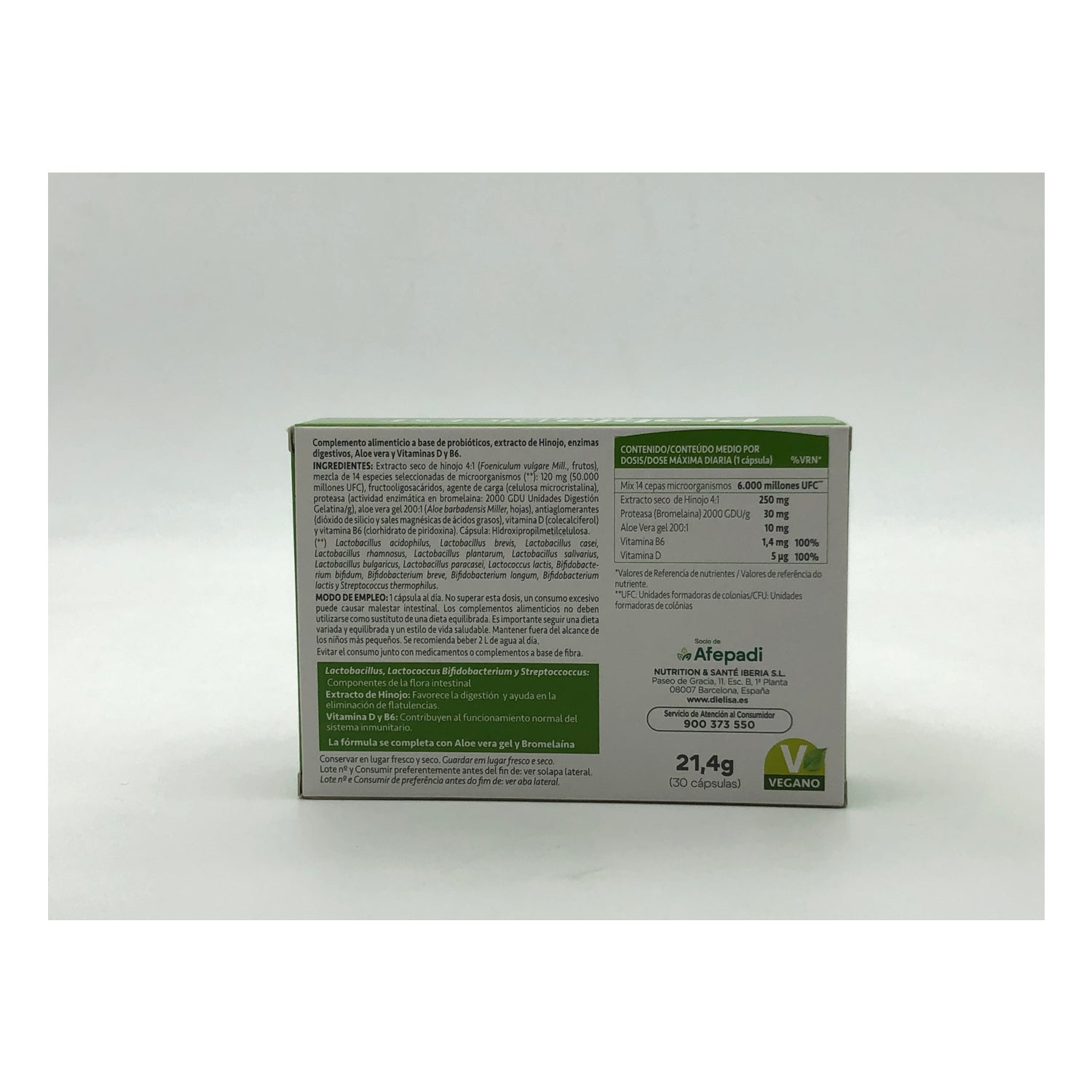 Dielisa Probio Digest to suplement diety, który reguluje florę jelitową, sprzyja trawieniu i eliminuje wszelkie rodzaje dyskomfortu lub zaburzeń trawiennych (gazy, wzdęcia, ból brzucha...). Jest to suplement zalecany dla każdego, szczególnie w przypadku obfitych posiłków lub ciężkości w żołądku.