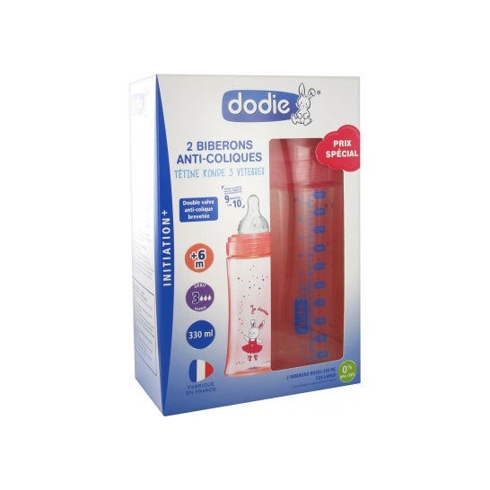 Opakowanie dwóch butelek antykolkowych Dodie w kolorze różowym i o pojemności 330 ml. Każda butelka ma opatentowany podwójny zawór antykolkowy, który ułatwia regularne odpowietrzanie. W zależności od pozycji, prędkość wypływu mleka może być różna - od wolnej do szybkiej. W zestawie znajdują się dwie ergonomiczne pokrywy, dzięki czemu można je łatwo otworzyć nawet wtedy, gdy można używać tylko jednej ręki. Te wyprodukowane we Francji butelki mają okrągły smoczek w kształcie lejka. Konstrukcja ta została zaprojektowana w taki sposób, aby prawidłowo dopasować się do ust dziecka i zapewnić mu satysfakcjonujące karmienie. Kolejną cechą są rowki zapobiegające przywieraniu mleka do ścianek butelki. Elastyczny silikon, z którego jest wykonana, sprzyja prawidłowemu karmieniu dziecka. *Kolor i wygląd produktu może się różnić w zależności od dostępności.