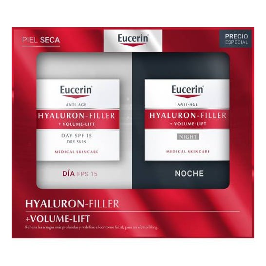 Eucerin Hyaluron Filler Volume Day & Night Pack jest wskazany do wypełnienia zmarszczek i ponownego zdefiniowania konturów twarzy. Kuracja ujędrniająca zawiera: