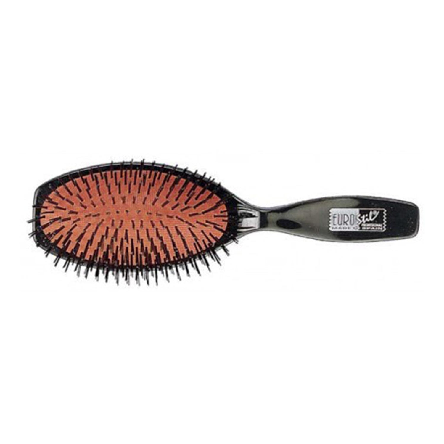 To duży, profesjonalny szczotka z nylonowymi włosiem. Zaprojektowany do wszystkich rodzajów włosów. Wytrzymałe włosie pomaga w szybkim rozczesywaniu wszystkich rodzajów włosów bez bolesnych szarpnięć. Jego ergonomiczna rękojeść idealna do łatwiejszego i bardziej wygodnego użytkowania. Wyjątkowa szczotka pneumatyczna z nylonowymi włosami do optymalnej pielęgnacji włosów i skóry głowy. Kolor: Czarny. Design: Owalny.