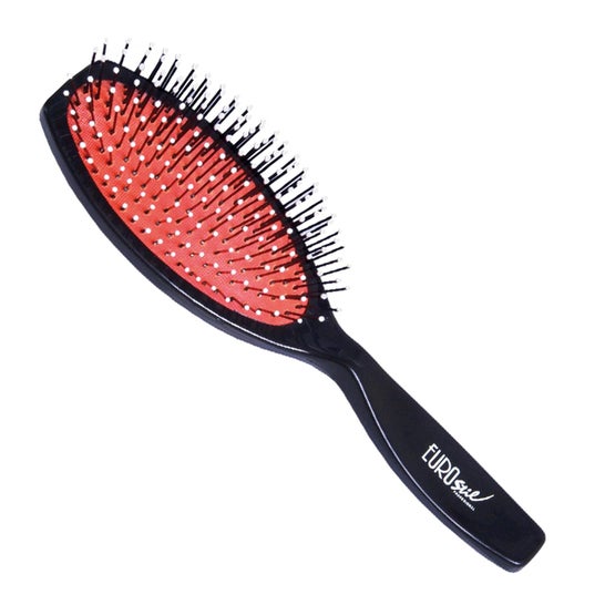 To duży szczotka z białymi nylonowymi ząbkami oddzielonymi i zakończonymi w kulkę, która sprzyja pielęgnacji włosów, ułatwia lepsze rozczesywanie i stymuluje skórę głowy, bardzo profesjonalna. Zaprojektowana do wszystkich rodzajów włosów. Wytrzymałe ząbki pomagają szybko rozplątać każdy rodzaj włosów bez bolesnych szarpanin. Ergonomiczna rękojeść idealna do bardziej zręcznego i wygodnego manipulowania. Wyłączna szczotka pneumatyczna z plastikowymi ząbkami zapewnia optymalną pielęgnację włosów i skóry głowy. Kolor: Czarny. Projekt: Owalny.
