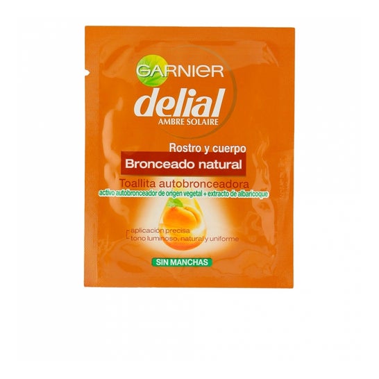 Garnier Delial Natural Tanning Wipes 6ml to chusteczki samoopalające przeznaczone do twarzy i ciała, łatwe w aplikacji. Idealne do uzyskania szybkiej, równomiernej, pięknej i promiennej opalenizny o każdej porze roku. Ich niebrudząca formuła zawiera składnik roślinny i ekstrakt z moreli.