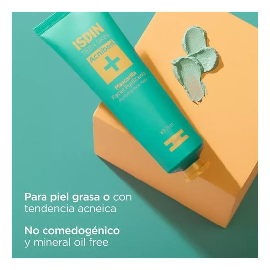 ISDIN Teen Skin Acniben Purifying Facial Mask 75ml to oczyszczająca maseczka do twarzy odpowiednia dla skóry tłustej lub trądzikowej. Pomaga również dogłębnie oczyścić cerę, dzięki kompozycji z glinką Tanakura, niacynamidem i cynkiem, składnikami, które pomagają absorbować nadmiar oleju i łagodzą zaczerwienienia skóry. Zawiera 75ml.