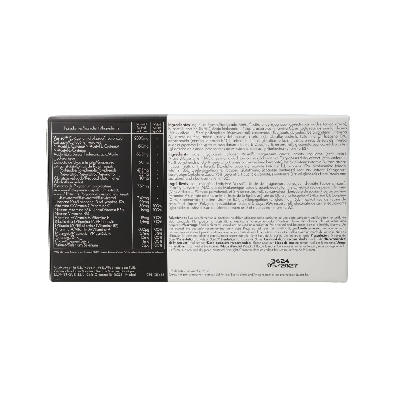 Luxmetique ProAge15vials Formula to suplement diety, który pomaga walczyć ze starzeniem się skóry dzięki zawartemu w formule kolagenowi, kwasowi hialuronowemu, przeciwutleniaczom, resweratrolowi, witaminom i minerałom.