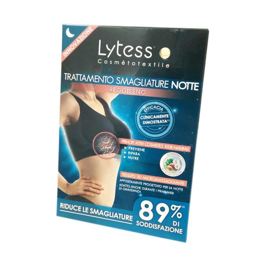 Lytess Bralette Stretch Marks Night TXXL 1szt. elastyczny biustonosz wykonany z tkaniny z mikromasażem, nasączonej naturalnym serum. wspomaga elastyczność delikatnej skóry piersi i pomaga zapobiegać powstawaniu rozstępów w tym obszarze. jest testowany klinicznie, a jego stosowanie jest zgodne z karmieniem piersią.