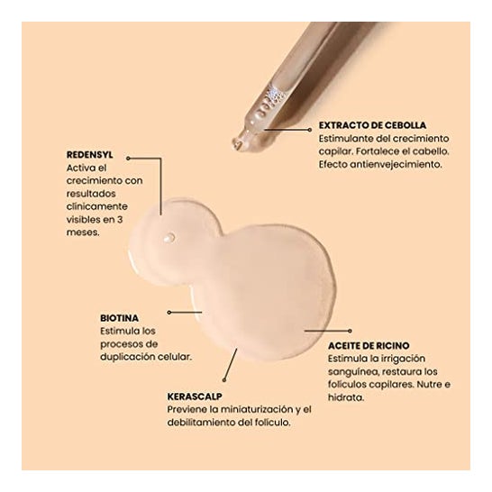 Lotion o działaniu przeciw wypadaniu włosów sformułowany z wyciągiem z cebuli, biotyną i olejem rycynowym do pielęgnacji włosów. Zawiera opatentowane składniki aktywne, takie jak Redensyl®, opracowane, aby pomóc w naprawie uszkodzonego włókna włosa poprzez stworzenie ochronnego filmu, który utrzymuje nawilżenie i ułatwia rozczesywanie. Redukuje powstawanie rozdwojonych końcówek. Wzbogacony o prowitaminę B5, Kerascalp i esencję z rozmarynu, o właściwościach przeciwzapalnych, wzmacniających i antyoksydacyjnych. Pomaga aktywować przepływ krwi do skóry głowy i mieszków włosowych, jednocześnie promując odżywianie i wzrost włosów.