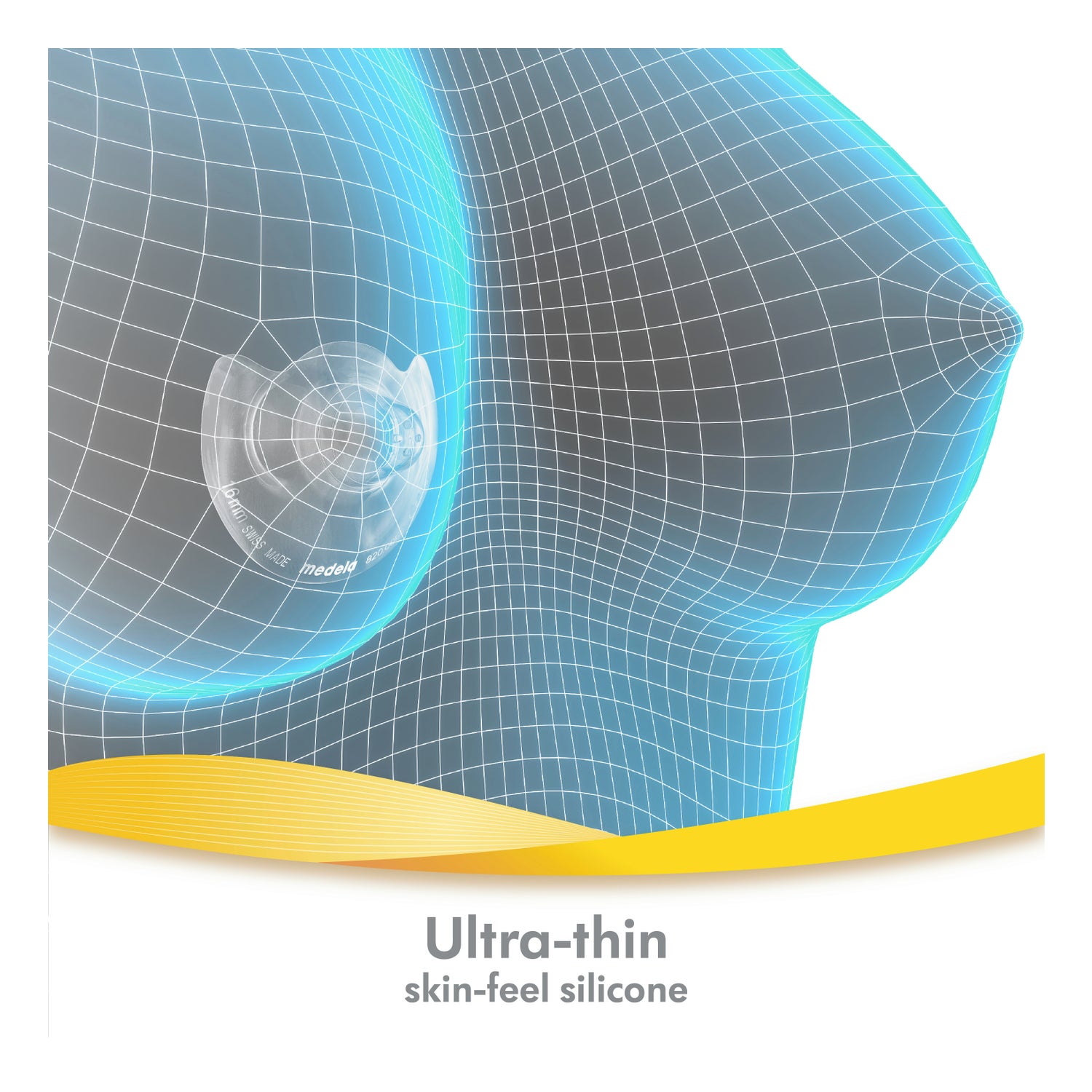 Dzięki ultracienkiemu silikonowemu materiałowi zapewnia miękki i wygodny kontakt dla matki i dziecka, który z łatwością dostosuje się do smoczka, który jest teraz chroniony. Silikon z wkładki Medela jest lekko elastyczny , zapobiegając i poprawiając dopasowanie do konturu piersi matki, a będąc silikonem nie pochłania zapachów ani smaków.