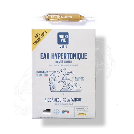 Woda hipertoniczna NUTRIVIE to woda morska wydobywana w Saint-Malo, Bretania, filtrowana na zimno na poziomie 0,2 mikrona, bez żadnej transformacji, aby zapewnić jej czystość. Opracowana zgodnie z rygorystycznym protokołem René Quinton, zawiera liczne minerały i pierwiastki śladowe podobne do naszego osocza krwi (magnez, wapń, potas, cynk, żelazo itp.), które pozwalają na rewitalizację naszego organizmu. *Magnez zawarty w wodzie hipertonicznej przyczynia się do prawidłowego funkcjonowania układu nerwowego, redukcji zmęczenia, a także do normalnej funkcji mięśni i struktury kostnej.