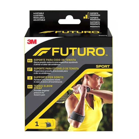 Jednorozmiarowy pokrowiec na łokieć Futuro ™ (17,8 do 35,6 cm) zawiera opatentowany pad ścięgna i regulowane zamknięcie, aby dostosować ciśnienie . Zapewnia wyższy poziom wsparcia przy użyciu kombinacji bardziej i mniej elastycznych materiałów. Zawiera również materiały, które pochłaniają uderzenia , pomagają łagodzić objawy związane ze szczepami, skręcenia, zapaleniem stawów, powtarzającymi się urazami i pomagają zapobiegać nawrotom.
