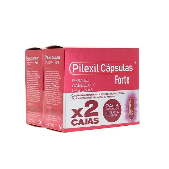 Pilexil Capsules Forte 2x100caps to preparat przeciw wypadaniu włosów w kapsułkach, który pomaga wzmocnić włosy i paznokcie. Ten suplement diety zawiera Serenoa serrulata, L-cysteinę, tokotrienol/tokoferol, żelazo, cynk, biotynę i 6 innych witamin.
