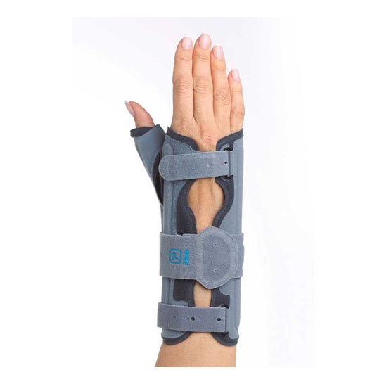 Prim Airmed Muñequera Larga Pulgar Derecha AM208 L 1 ud jest zaprojektowana do unieruchomienia nadgarstka i kciuka. Jej główną funkcją jest stabilizacja prawej ręki, ograniczając zgięcie grzbietowo-dłoniowe i oferując pełne wsparcie dla kciuka.