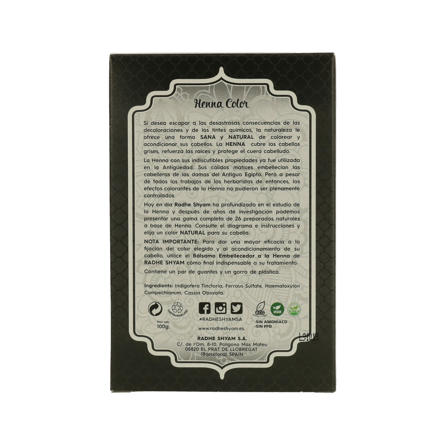 Czarna barwna Radhe Shyam Henna jest ekskluzywnym naturalnym barwnikiem, bez chemikaliów w swoim składzie, który oferuje wszystkie właściwości natury, aby zabarwić włosy. Obejmuje szare korzenie, wzmacnia włókno i chroni skórę głowy.