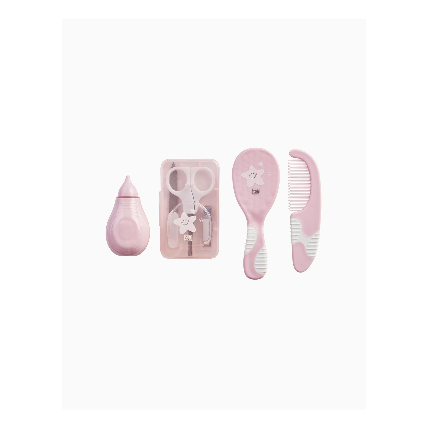 Zestaw 7 akcesoriów specjalnie zaprojektowanych do pielęgnacji i higieny maluchów. Zawiera butelkę z kroplomierzem, aspirator do nosa, grzebień, szczotkę z naturalnego włosia, praktyczne nożyczki, obcinacz do paznokci i cztery pilniki do paznokci. W zestawie torba z organizerem do noszenia wszędzie, z różowym wodoodpornym materiałem. Są to produkty długotrwałe, wykonane z trwałych materiałów.