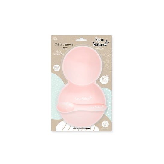 Naczynia wykonane z silikonu klasy medycznej, który pomaga dzieciom w nauce jedzenia. Posiada właściwości termiczne, które wytrzymują wysokie temperatury bez utraty swoich właściwości. Jego konstrukcja z podwójną miską ułatwia przenoszenie. Posiada ergonomiczną łyżeczkę z zaokrągloną końcówką, która nie uszkadza dziąseł.