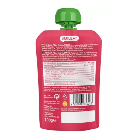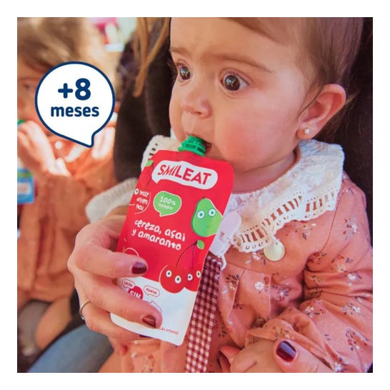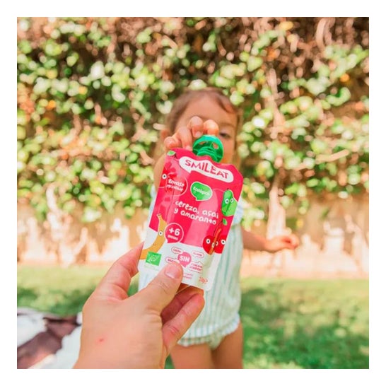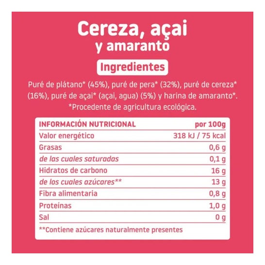 Opakowanie do picia składające się z wiśni, acai i amarantusa, idealne na śniadanie, przekąskę lub podwieczorek dla dzieci od 8 miesiąca życia. Jego miękka i łatwa do picia konsystencja sprzyja rozwojowi żywieniowemu maluchów, ponieważ nie zawiera mleka, glutenu jajecznego, dodatków ani cukrów dodanych. Ponadto, opakowania pochodzenia roślinnego są przyjazne dla środowiska.