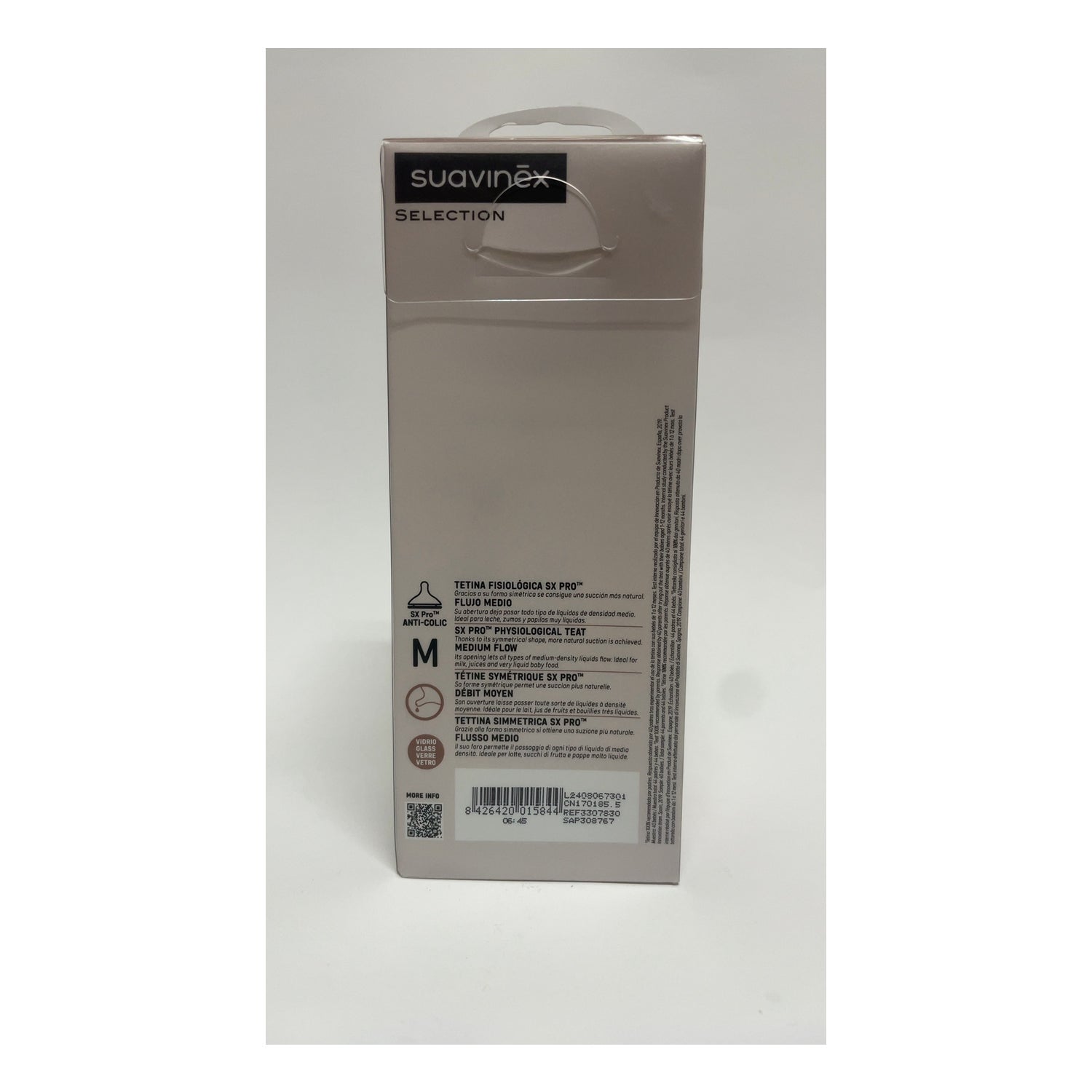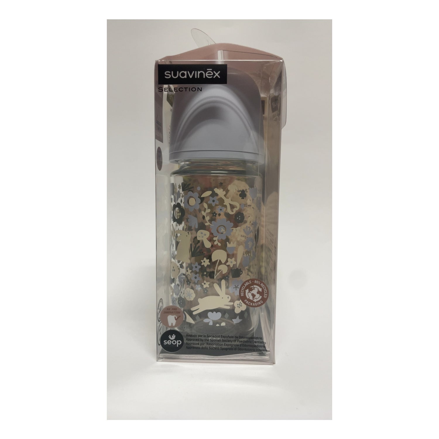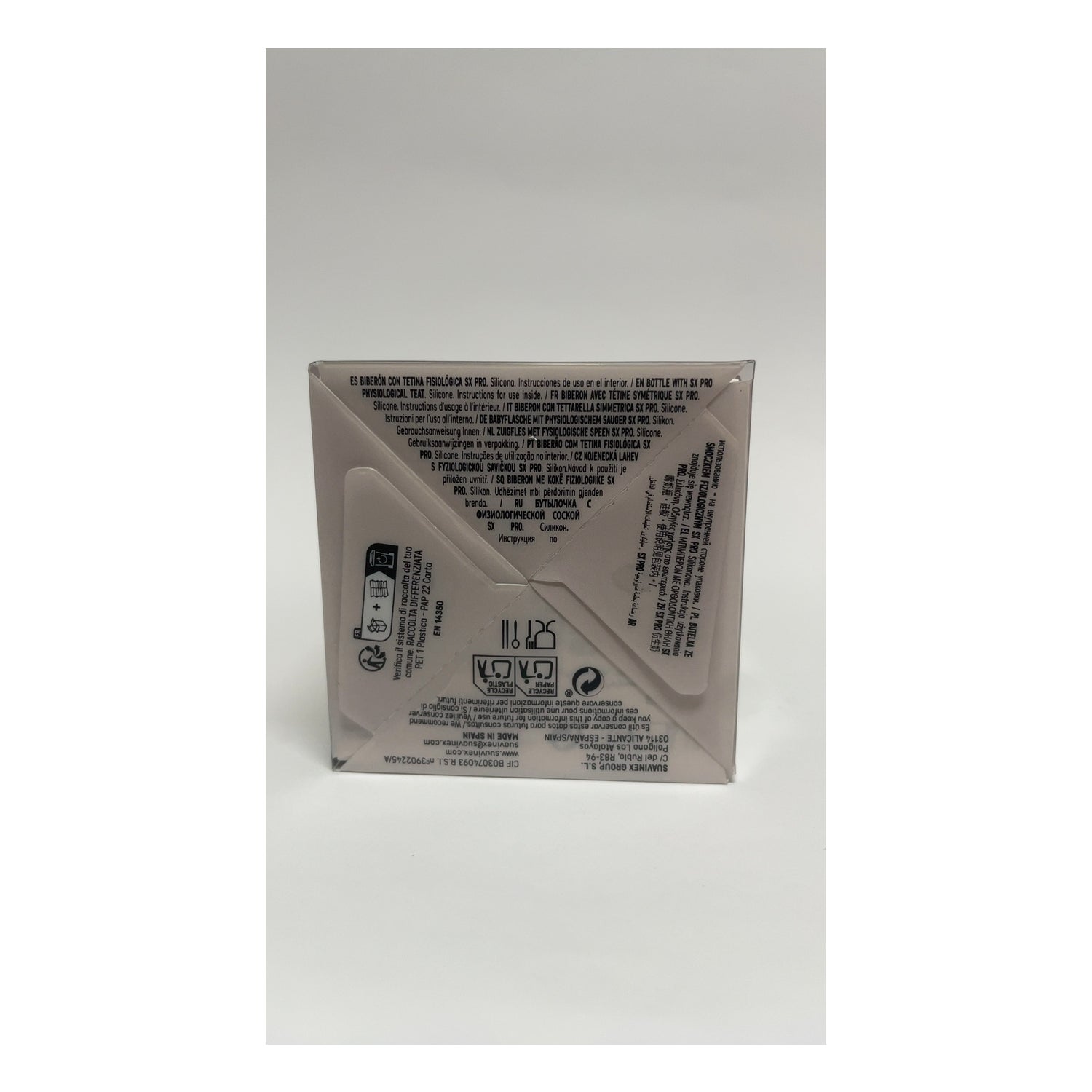 Zapewnia smoczek fiziologiczny SX PRO o średnim przepływie i jest wykonana z 100% recyklingowego szkła, materiału, który nie wchłania ani zapachów, ani smaków.