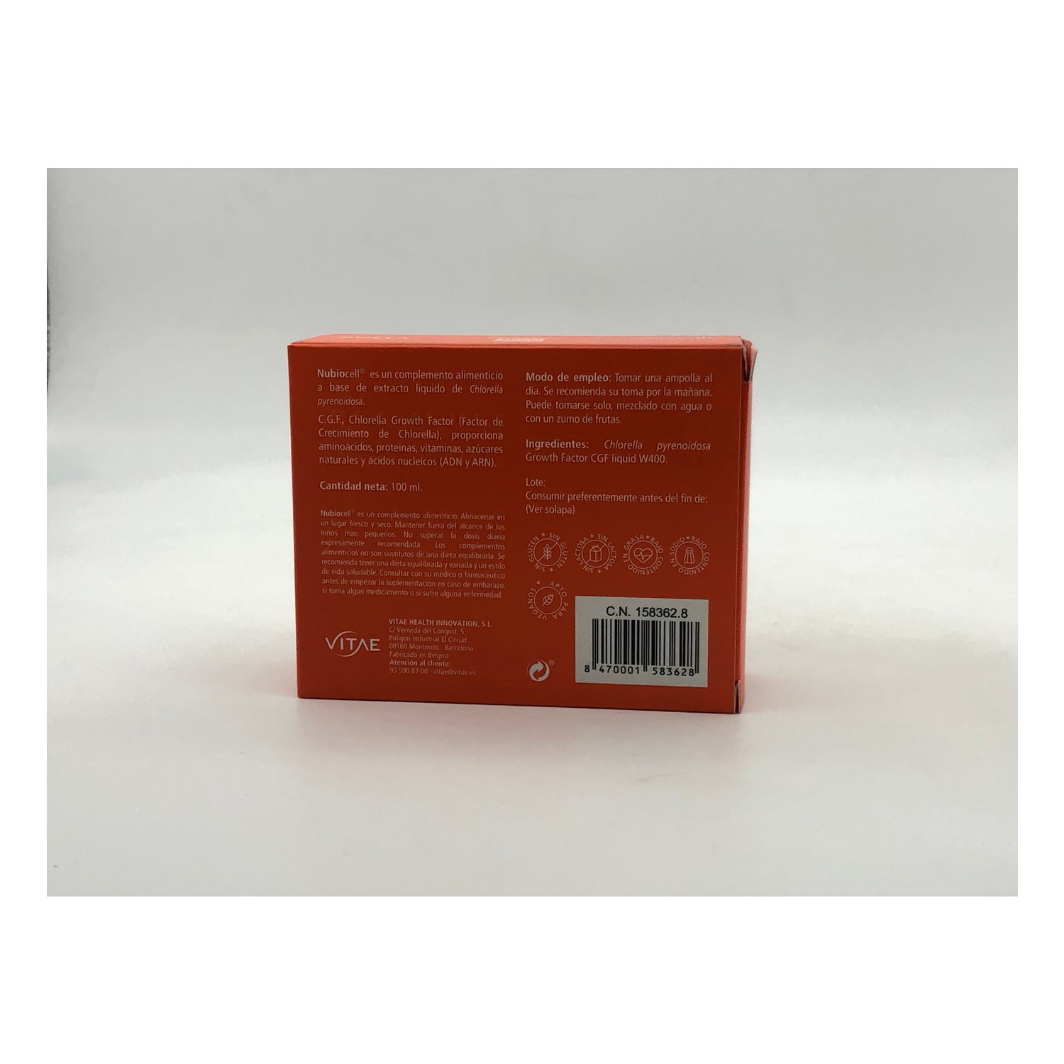 Vitae Nubiocell® 10amp to suplement diety, który wyróżnia się dzięki skoncentrowanemu chlorofilowi, ponieważ został stworzony na bazie rdzenia Chlorella pyrenoidosa, znanego również jako esencja Chlorella. I nie tylko to, ten gatunek mikroalgi zawiera czynnik wzrostu chlorelli (CGF) lub czynnik wzrostu chlorelli .