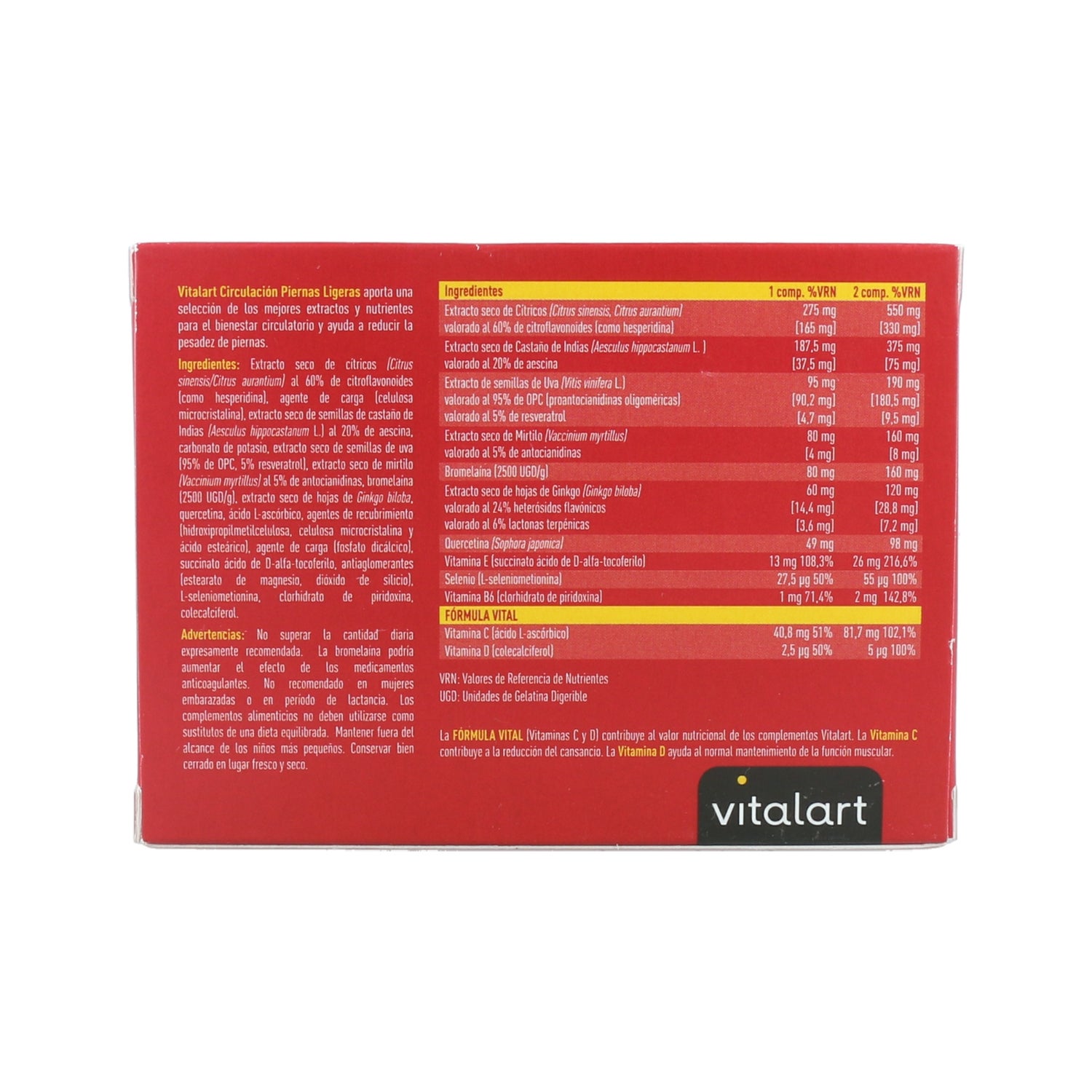 Vitalart Circulación Piernas Ligeras 60comp to suplement diety, który pomaga zmniejszyć ciężkość nóg. Zapewnia wybór najlepszych ekstraktów i składników odżywczych dla dobrego samopoczucia układu krążenia.