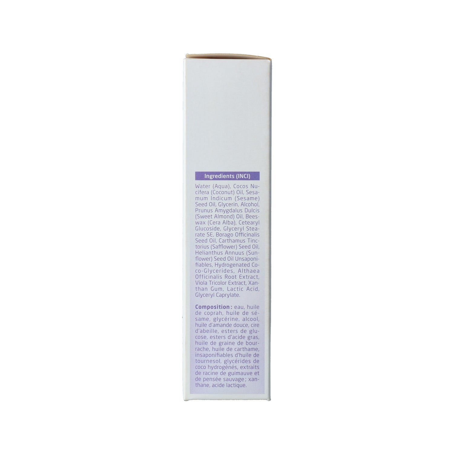 WATER COCOS NUCIFERA OIL SESAMUM INDICUM SEED OIL GLYCERIN ALCOHOL PRUNUS AMYGDALUS DULCIS OIL CERA ALBA CETEARYL GLUCOSIDE GLYCERYL STEARATE SE BORAGO OFFICINALIS SEED OIL CARTHAMUS TINCTORIUS SEED OIL HELIANTHUS ANNUUS SEED OIL UNSAPONIFIABLES HYDROGENATED COCO-GLYCERIDES ALTHAEA OFFICINALIS ROOT EXTRACT VIOLA TRICOLOR EXTRACT XANTHAN GUM LACTIC ACID GLYCERYL CAPRYLATE