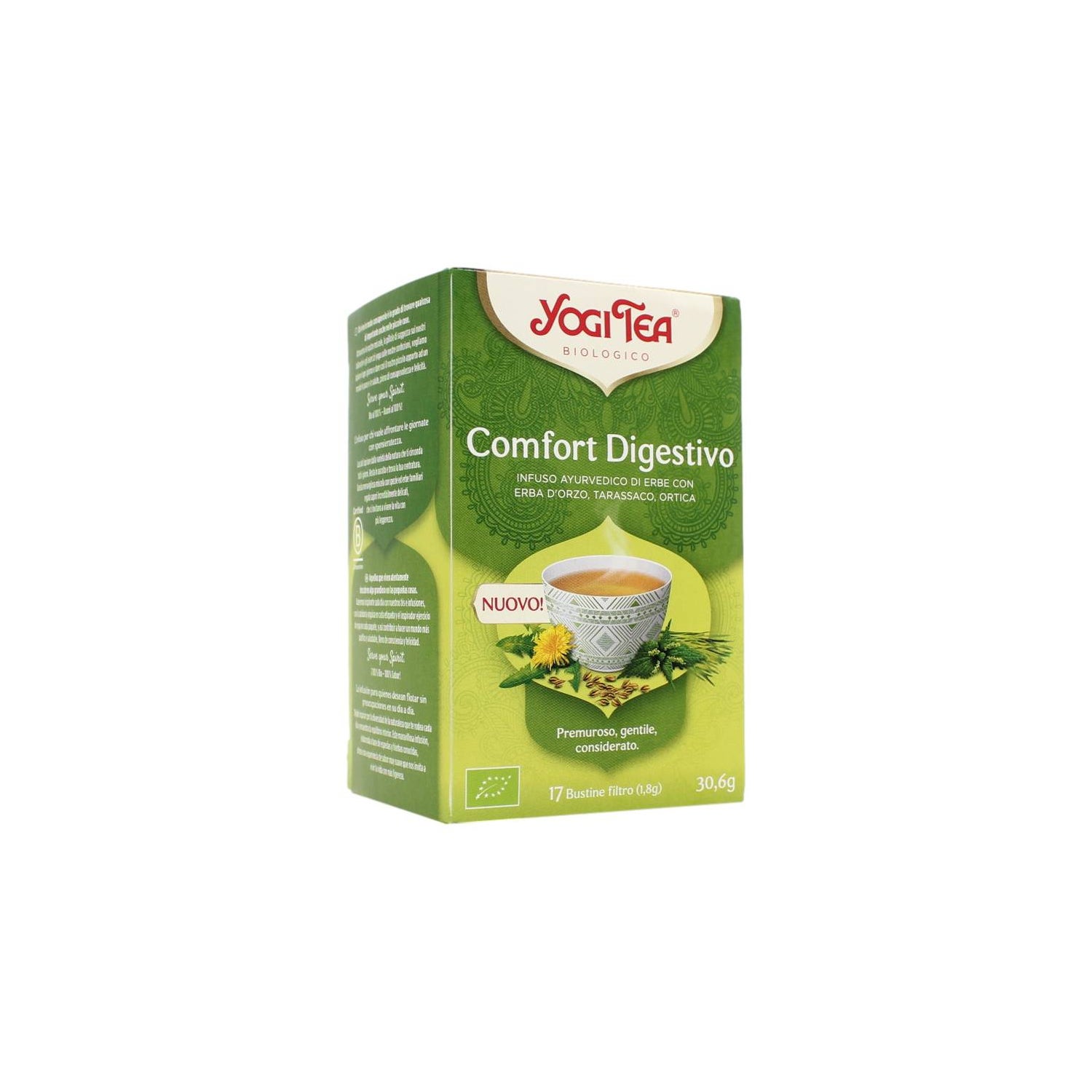 Yogi Tea Confort Digestivo Bio 17 Bolsitas to ekologiczny napar ajurwedyjski bez kofeiny, stworzony, aby wspierać lekka trawienie i przynosić dobrostan po posiłkach. Oferuje łagodny i zrównoważony smak, odpowiedni na każdą porę dnia.