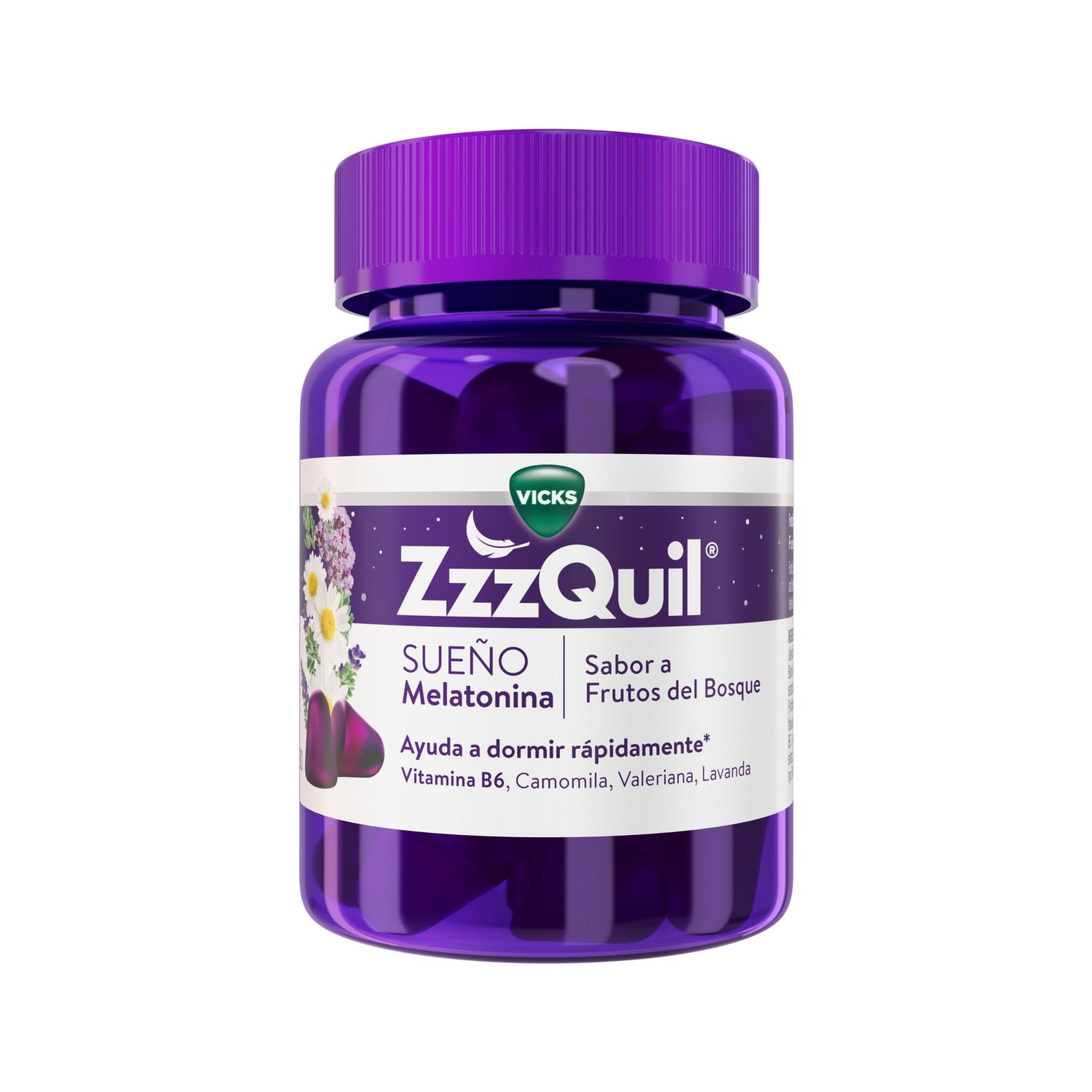 ZzzQuil Natura Melatonin Red Fruits 30 żelków to suplement diety w formie żelków. Wspomaga odpoczynek i pomaga szybko zasnąć dzięki mieszance składników roślinnych, w tym lawendy, rumianku, melisy i korzenia waleriany.